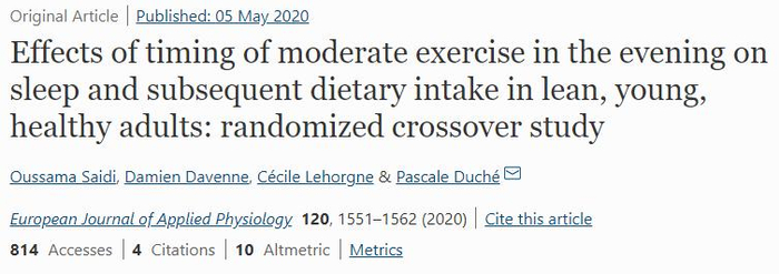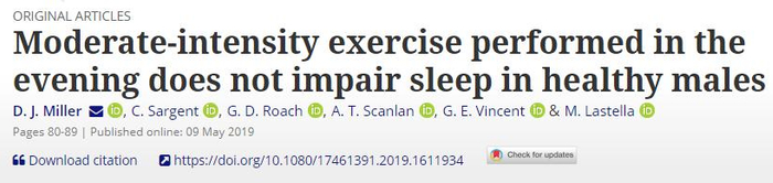 [2]Moderate-intensity exercise performed in the evening does not impair sleep in healthy males. DOI:10.1080/17461391.2019.1611934