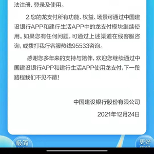 12月24日,建设银行公告,龙支付APP将从各大应用商店下线,龙支付APP将无法下载,龙支付APP功能不再更新,所有功能、权益、场景可通过中国建设银行APP、建行生活APP中的龙支付模块继续使用。