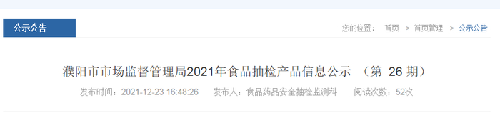 河南省濮阳市市场监管局公示2021年第26期食品抽检产品信息