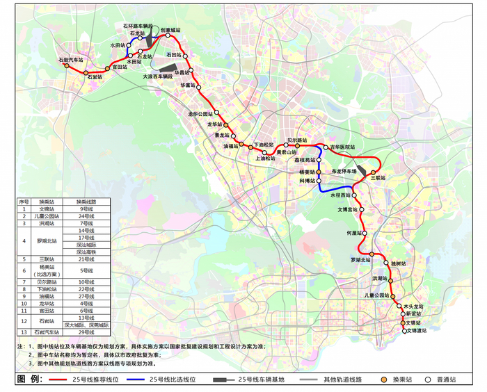 根据深圳市规划和自然资源局编制的《深圳市城市轨道交通25号线交通详细规划》,轨道25号线是联系罗湖与龙华的一条普速线路,主要承担都市核心区辐射带动、加强原关外区域轨道盲区覆盖,促进全市域平衡发展的功能,可加强石岩、大浪、龙华和坂雪岗片区对外交通联系,缓减跨关交通压力。线路起自罗湖文锦片区,终至宝安石岩西片区。线路沿线联系文锦、清水河、坂雪岗科技城、龙华商务中心、大浪时尚创意城、石岩健康绿谷等片区,并与轨道网络多条线路衔接换乘。
