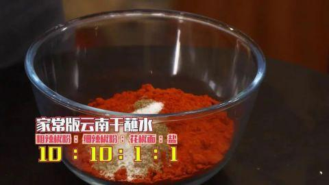 云南的特色美食,离不开特有的蘸水。和海凤今天打算做一款干蘸水,具体做法是:在碗中放入粗辣椒粉、细辣椒粉、花椒面、盐搅拌均匀,四者比例为10:10:1:1,大家还可以根据喜好往其中加入鸡精、蒜末、葱花、香菜等调味料。