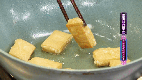 锅内倒油,加一点盐,油热后下入包浆豆腐煎制,煎到两面金黄即可出锅。