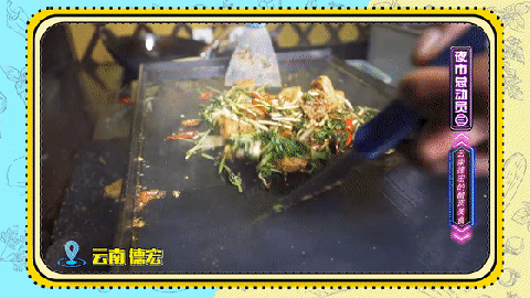 下一个打卡的美食是德宏夜市的“火爆单品”——包浆豆腐。米白色的包浆豆腐和蒜末、小米辣、葱花、折耳根、辣椒粉、水香菜、酱油等调味料在铁板上一起炒匀,香气四溢,闻着就让人食指大动。