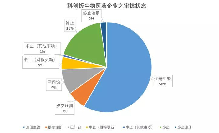 目前已申报科创板的132家生物医药企业中,共77家已通过证监会注册,占已申报企业数量的58%;27家终止了上市审核,占已申报企业数量的20%。具体审核状态如下图所示: