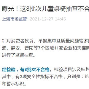 中国网财经12月27日讯 据上海市场监管微信公众号消息,针对消费者投诉、举报集中及质量问题较多的产品,近期,上海市市场监管局集中执法力量对黄浦、静安、普陀等7个区域11家企业和2个网络交易平台销售的儿童桌椅进行了监督抽查。