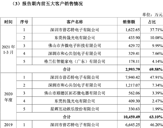 芯亿达主要从事消费及工业类功率驱动芯片的设计、研发和销售,主要产品包括电机驱动系列芯片、电子开关系列芯片、玩具电控系列芯片与人体感应系列芯片。据重组报告书披露,2019年至2021年1-3月,深圳市普芯特电子有限公司(以下简称“普芯特)一直是芯亿达的第一大客户,销售金额分别为6645.25万元、7940.42万元、1622.65万元,占芯亿达营业收入的比重分别为46.20%、47.91%、37.71%;佛山市顺德区拓芯微电器有限公司(以下简称“拓芯微”)是芯亿达2019年、2020年第三大客户。