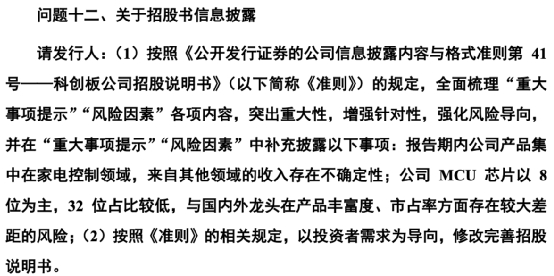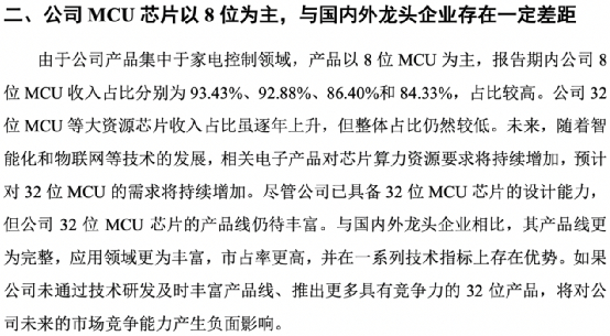 技术先进性是科创板上市的关键要素,但根据审核问询回复,中微半导在芯片内核先进性、内存空间、最高主频、芯片制程等技术指标方面均落后于意法半导体、瑞萨电子、恩智浦半导体等行业龙头,产品以8位MCU为主,大资源芯片的销售占比较低。对此,交易所在第二轮审核问询中,要求中微半导在招股书“重大事项提示”、“风险因素”中补充披露以下事项:报告期内公司产品集中在家电控制领域,来自其他领域的收入存在不确定性;公司MCU芯片以8位为主,32位占比较低,与国内外龙头在产品丰富度、市占率等方面存在较大差距的风险。