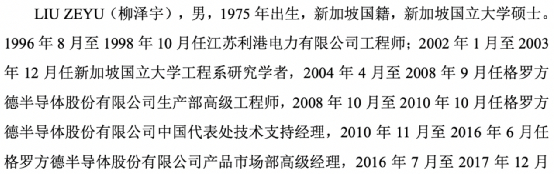 LIU ZEYU(柳泽宇)于2018年1月入职中微半导,现任公司副总经理,招股书披露的简历显示,其2004年4月至2016年6月期间就职于格罗方德半导体股份有限公司(以下简称“格罗方德”),历任生产部高级工程师、中国代表处技术支持经理、产品市场部高级经理。LIU ZEYU曾经任职多年的格罗方德看似与中微半导没有什么业务关联,但公开信息显示,格罗方德实际上就是GLOBALFOUNDRIES。