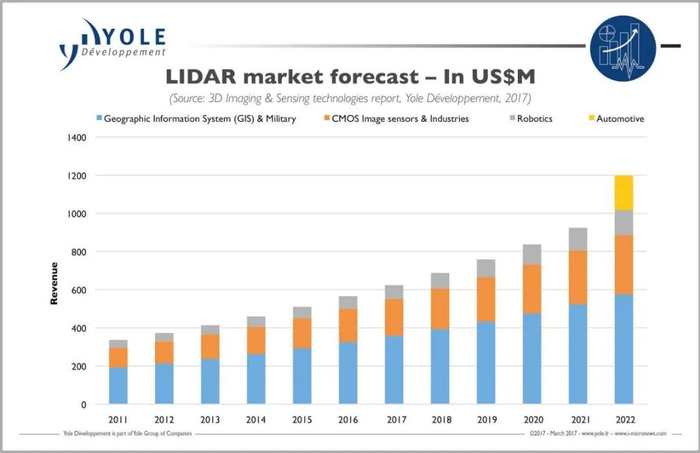根据咨询公司 Yole 预测,激光雷达市场规模将从2020年的18亿美元增至2026年的57亿美元,年均复合增长率将达到21%。