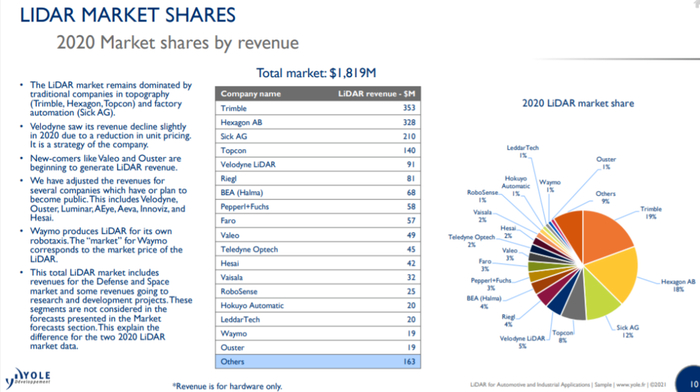 但在2020年,前三甲还是工业机器人与空地测量等领域的激光雷达提供商Trimble、Hexagon AB与Sick AG,车载激光雷达提供商Velodyne 仅位列第五。