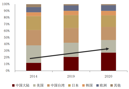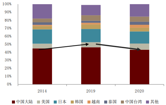 图表:中国大陆产能份额有所下降