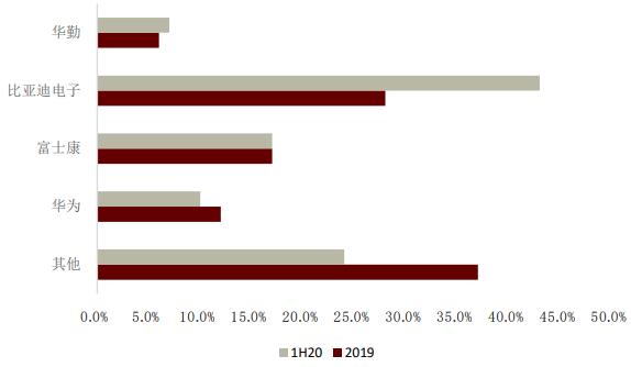手机委外代工比例持续提升,大陆ODM组装厂商出货量仍有望提高。以华为为例,公司大陆市场份额从2019年的36%提升至1H20的45%,比亚迪电子、华勤获得大部分华为手机增量订单,在华为组装供应份额提升较为明显。此外,比亚迪电子在华为手机组装的份额由28%提升至43%,富士康则仍然保持原先份额。尽管手机市场已进入存量博弈阶段,但我们认为终端品牌厂商委外加工的比例提高外加对大陆组装的扶持仍将继续强化大陆组装厂商优势。