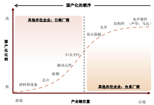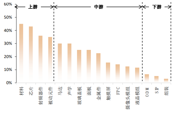 手机供应链中,大陆厂商早期从中游环节切入。手机产业链可以分为上游材料和芯片、中游零组件及下游组装代工环节。大陆厂商早期从马达、声学、玻璃盖板、面板等毛利率较高的零部件切入,目前已在中游零部件环节占据重要地位,电声、结构件及光学等工序已经出现龙头企业。而后大陆厂商通过向产业链下游进行纵向延伸。一方面切入下游组装有利于厂商获取品牌客户的零部件订单,另一方面通过垂直整合可以提升厂商整体利润水平和全方案的竞争力。