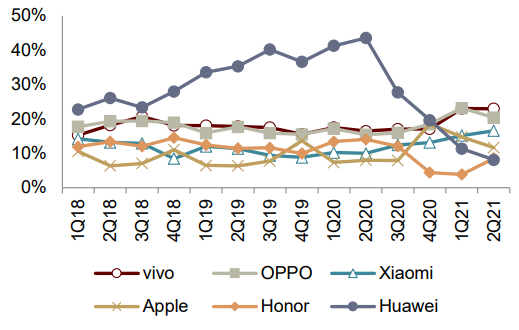资料来源:IDC,中金公司研究部;注:华为2Q20后剥离荣耀