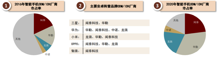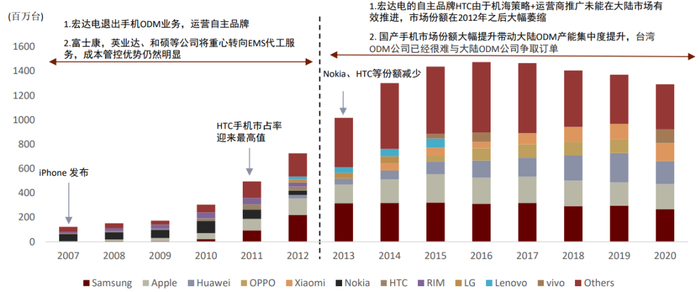 2012年之后,一方面由于中国台湾品牌商HTC在大陆市场未能有效推进,市场份额降低;另一方面由于国产手机品牌的崛起推动国内ODM公司成长,因此手机组装市场份额逐渐向国内头部ODM/EMS厂商龙头集中。