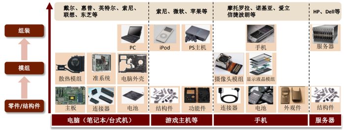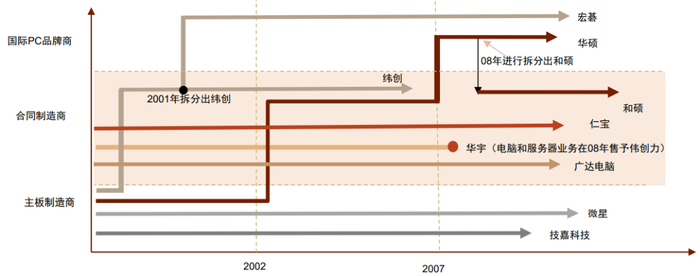 回顾从1995年-2010年的中国台湾组装厂商发展路径,我们看到在过去的组装企业大致遵循两类路线:1)自始至终扮演电子组装代工厂的角色,持续扩张产能和强化规模效应,如仁宝、广达。2)从PC品牌商剥离成为独立组装厂,例如和硕以及纬创。品牌商如宏碁、华硕从主板制造商起步,后发展成为PC合同制造商,承接惠普、戴尔等头部PC品牌商的代工订单,并逐渐延伸至其他电子产品代工,最后跃迁为国际PC品牌商。但考虑下游品牌商削减代工订单压力,上述公司又陆续剥离组装业务,成立独立代工企业以承接母公司及其他下游客户订单。