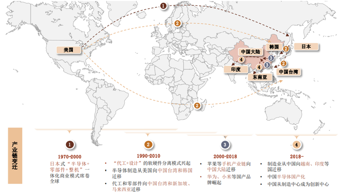 全球电子制造产业沿欧美→日本→韩国/中国台湾→中国大陆→东南亚路线迁移。自20世纪70年代至今,全球电子制造业经历四次迁移。1)20世纪70年代,日本承接了全球电子制造产业的第一次迁移,日本式“半导体+零部件+整机”一体化商业模式席卷全球。2)90年代开始,“代工+设计”的软硬件分离模式兴起。其中半导体制造从美国向中国台湾和韩国迁移,代工和零部件向中国台湾和新加坡、马来西亚迁移。3)21世纪初,欧美日等发达国家和亚洲“四小龙”等新型工业化国家把劳动密集型和低技术性产业向发展中国家转移。中国成为第三次产业迁移的最大承接地。在此阶段,苹果等手机产业链向中国大陆迁移。与此同时,华为、小米等国产品牌崛起。4)2018年后,随着我国人口红利消失,劳动成本不断提升,制造业从中国开始向越南、印度等低成本国家转移。在此背景下,中国大力发展半导体国产化,力图将自身从“世界制造中心”转型成为“创新中心”。