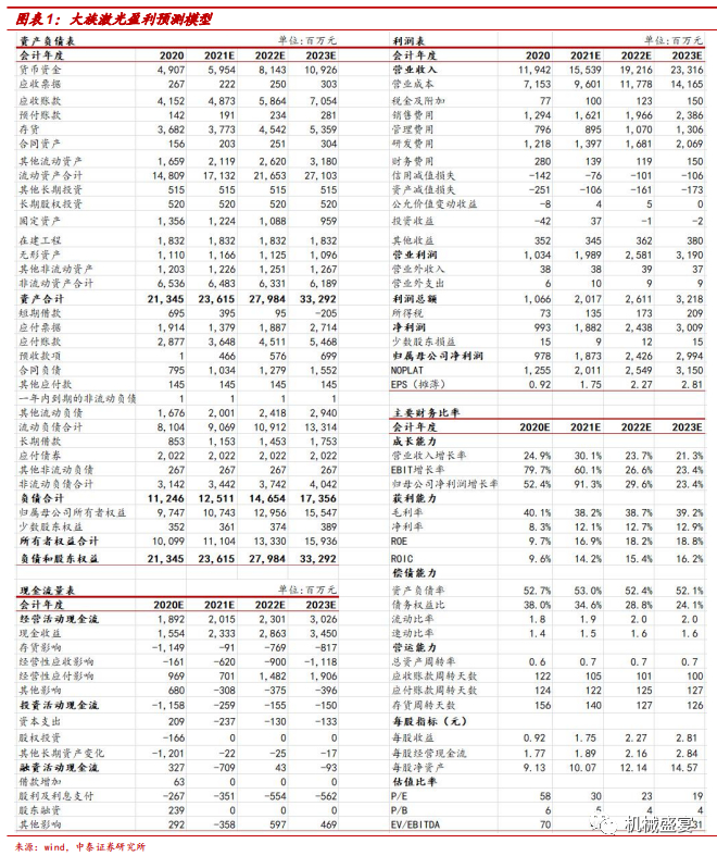维持“买入”评级。公司作为激光设备行业绝对龙头,围绕“激光+X”战略持续推进业务。伴随3C、PCB、新能源等行业景气度上升,公司各项业务有望充分受益。我们维持此前的业绩预测,预计2021-2023年公司营收分别为155.39亿元、192.16亿元、233.16亿元;归母净利润分别为18.72亿元、24.26亿元、29.94亿元,对应PE分别为30、24、19倍。维持“买入”评级。