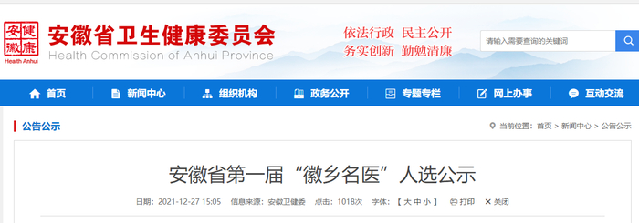 现予以公示,公示期为2021年12月27日至12月31日。如对第一届“徽乡名医”人选有异议,请在公示期内(工作日上午8:00-12:00,下午14:30-17:30)向省卫生健康委人事处、驻委纪检监察组反映。