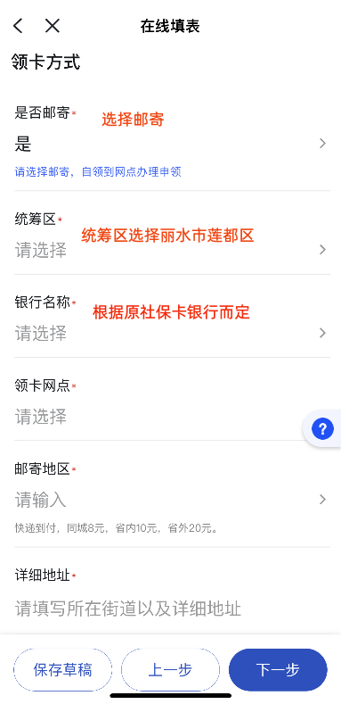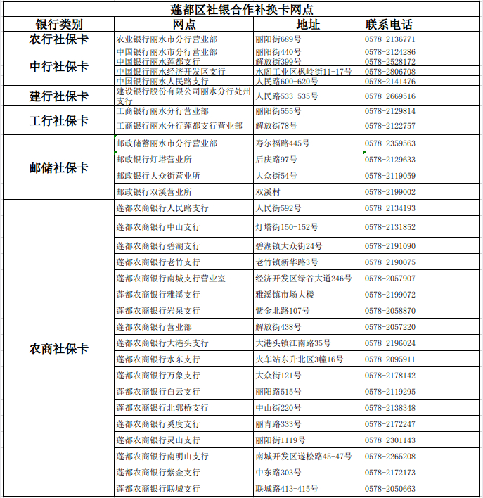 现场办理:本人持身份证和二代社保卡到相对应的银行网点即可更换。(下图为莲都区补换卡网点)