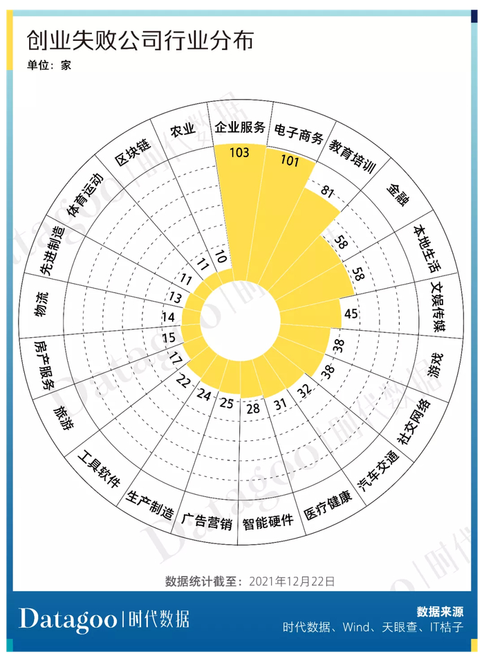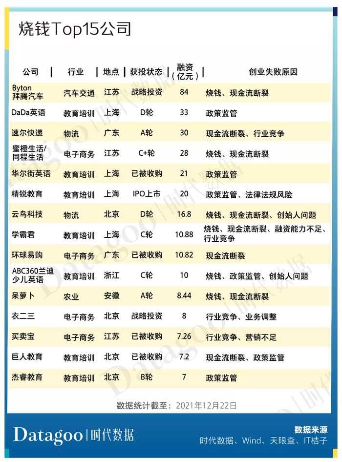据时代数据梳理,在今年倒下的最为烧钱的15家公司中,来自教育培训行业的公司就有7家,其中有6家是受“双减”政策影响,同时也存在烧钱、现金流断裂等原因;来自电子商务行业的公司有4家,其中除1家社区团购类公司外,跨境电商、共享租衣等类型的电商公司也开始洗牌;来自物流行业的公司有2家,除速尔快递外,还有一家主打同城快速配送、估值曾一度高达70亿元的独角兽企业云鸟科技也不幸倒下;另两家公司分别来自汽车交通行业和农业行业。