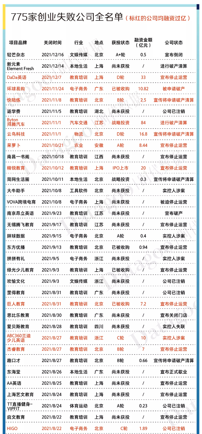 原标题:2021年创业公司倒闭名录:775家公司倒下,近八成公司是因为这个原因