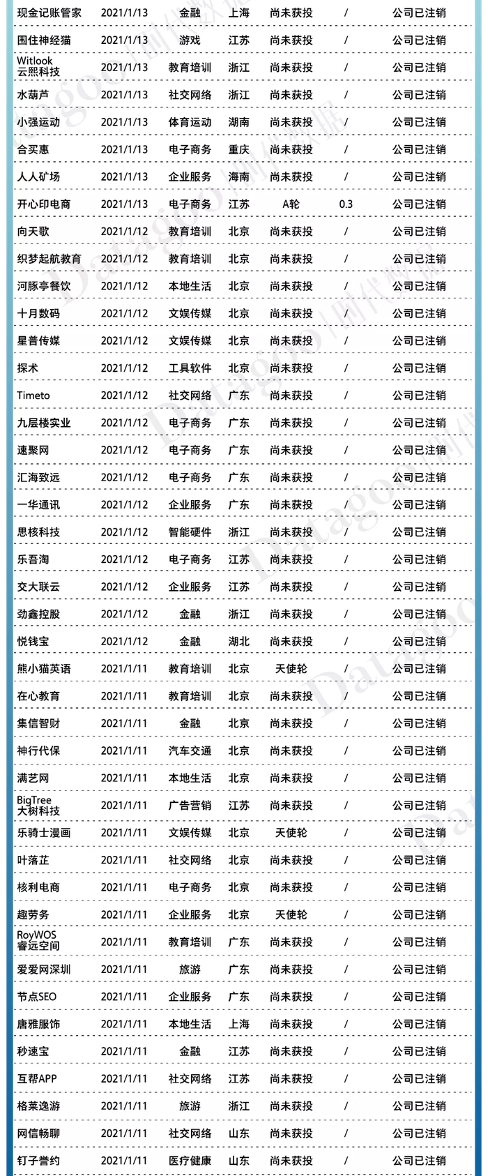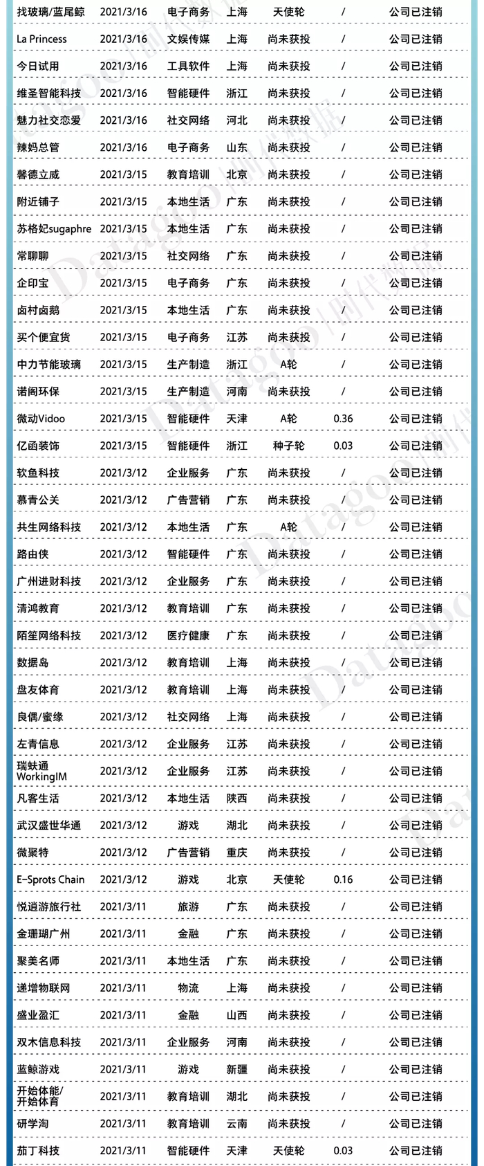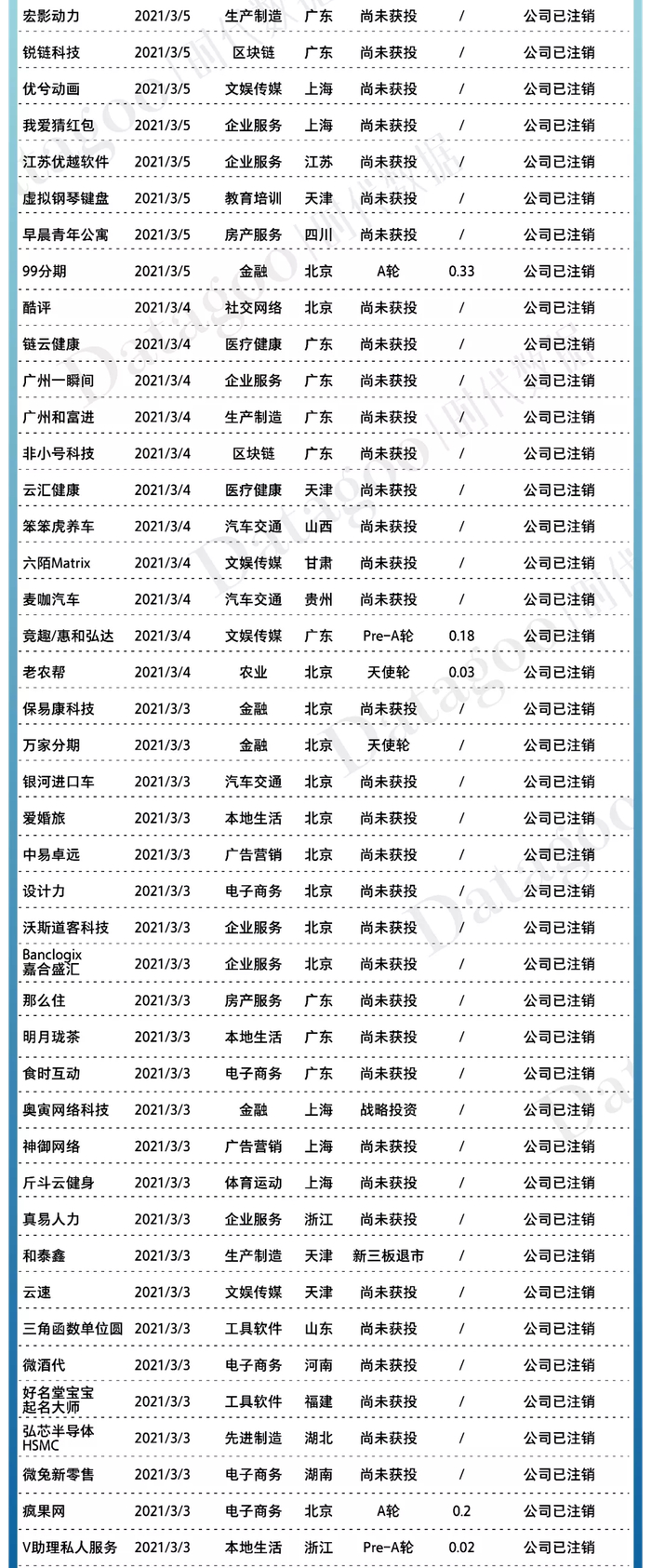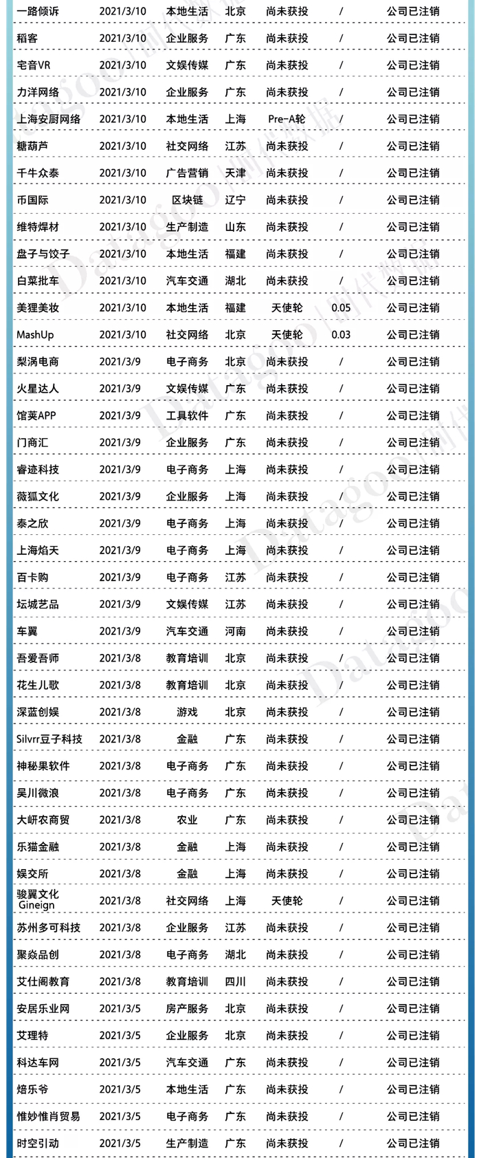 对此,时代数据连续第三年推出“创业公司倒闭名录”,涵盖了最新的创业公司注销或暂停运营名单,还收录了各创业公司的关闭时间、所属行业、注册地点、融资情况、关闭原因等客观信息。
