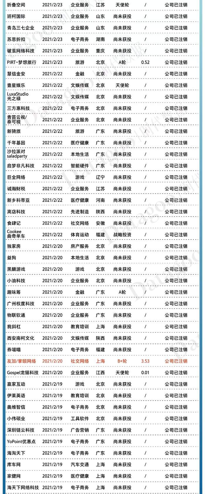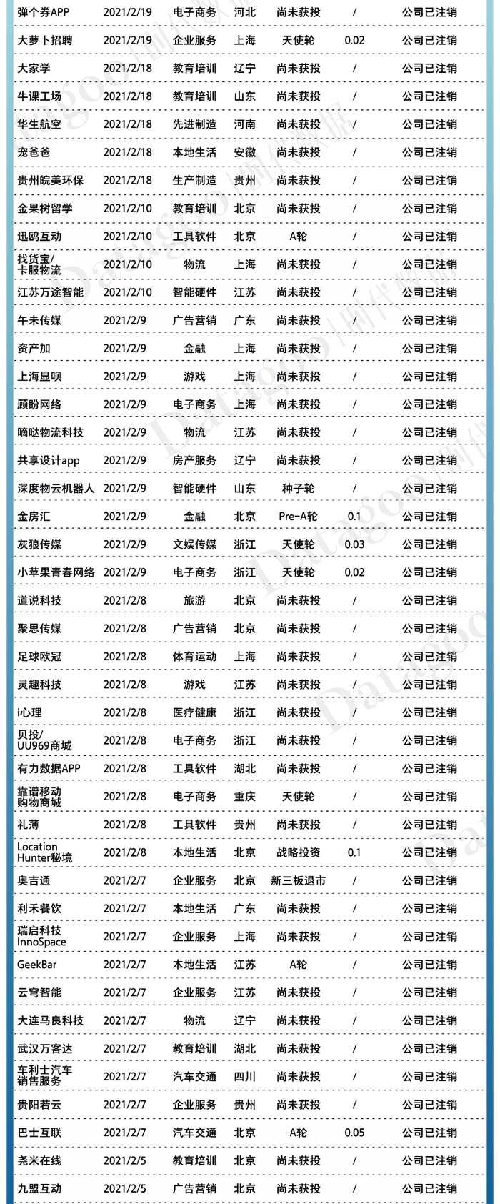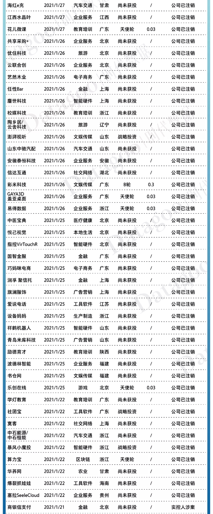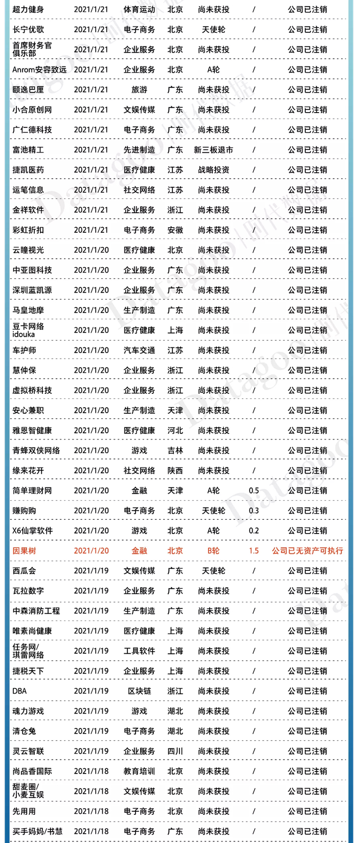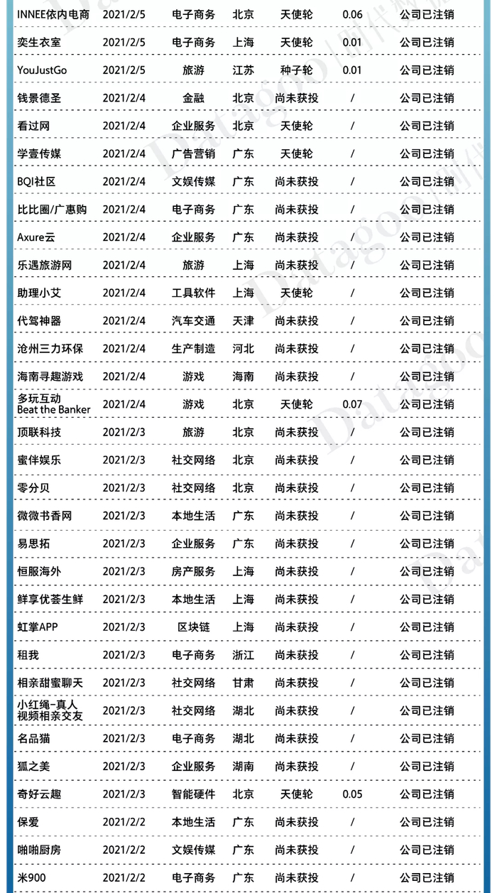 对此,时代数据连续第三年推出“创业公司倒闭名录”,涵盖了最新的创业公司注销或暂停运营名单,还收录了各创业公司的关闭时间、所属行业、注册地点、融资情况、关闭原因等客观信息。