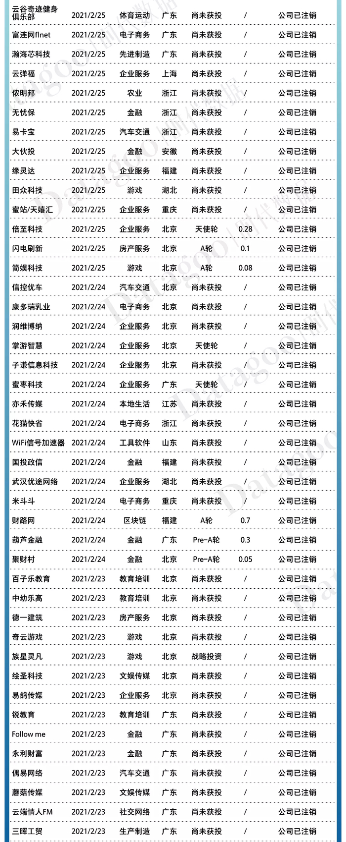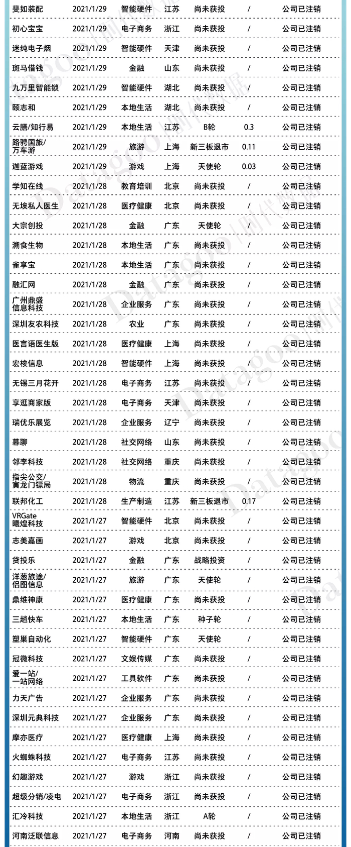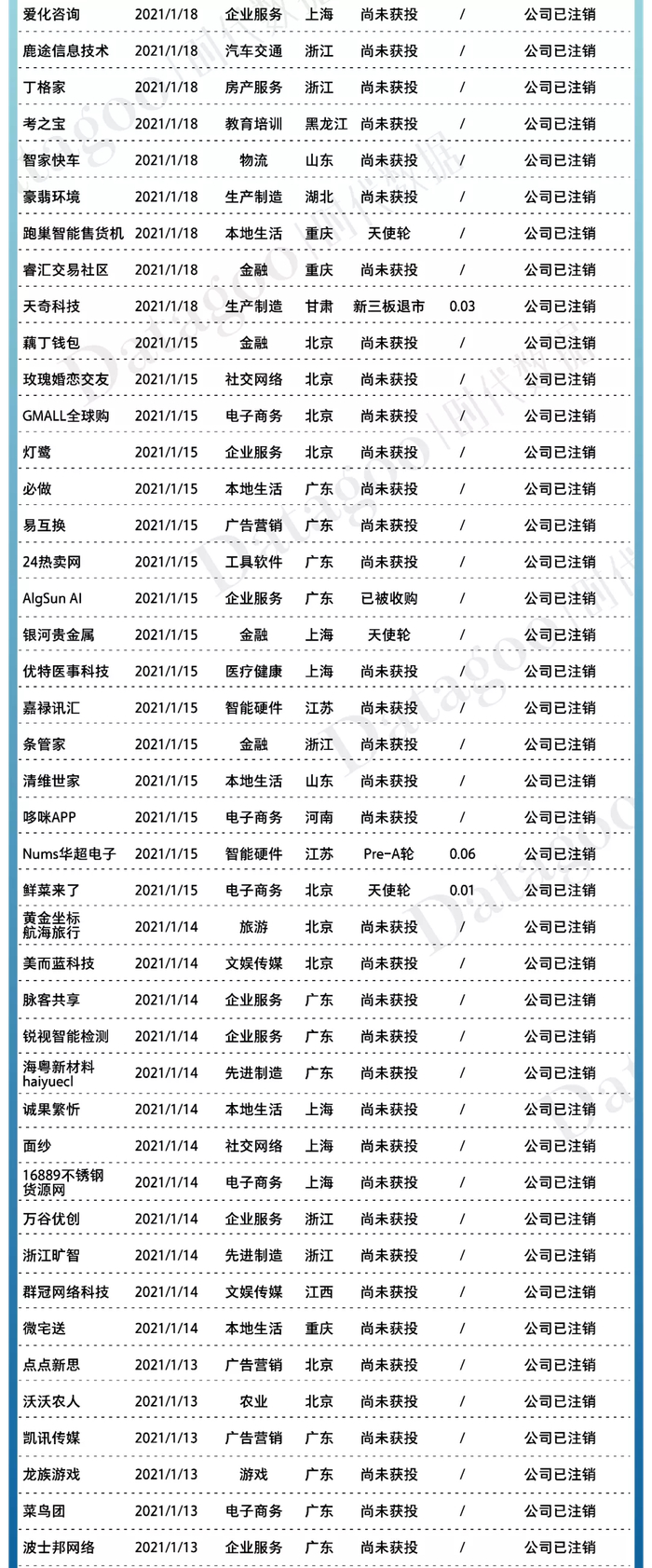 在经历了去年初的疫情后,资本变得越来越谨慎。缺少了资本的加持,创业公司深陷现金流断裂困境,逐渐走向破产清算。1月下旬,曾在新三板挂牌的天奇科技(832561.NQ)、富池精工(836107.NQ)、联邦化工(832517.NQ)、路骋国旅(831320.NQ)4家公司先后关闭,注销工商执照,退出创业舞台。