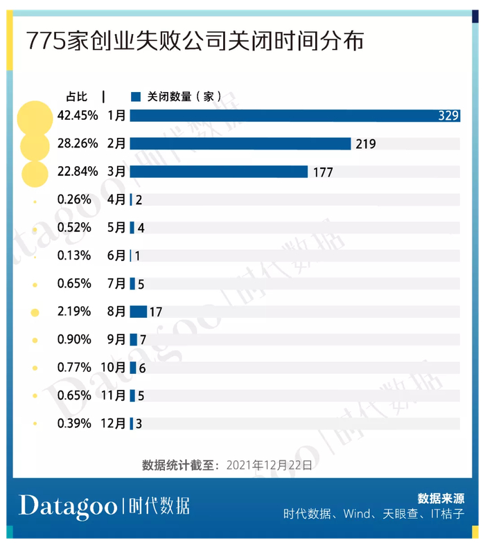 从各月份来看,1月份关闭的公司最多,达到329家,占42.45%;其次是2月份和3月份,分别关闭219家和177家。今年一季度累计关闭创业公司725家,占全年的93.55%。
