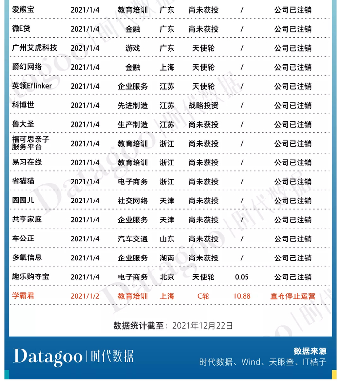 紧随其后的是专业在线外教英语DaDa英语,融资约33亿元。12月7日,哒哒英语公开宣布,将于12月31日全面停止所有外教服务,公司将分批办理退费。