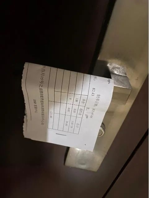 邻居称张某家的4栋15-4房间很少有人住,物业在门把手上贴有缴费通知单。