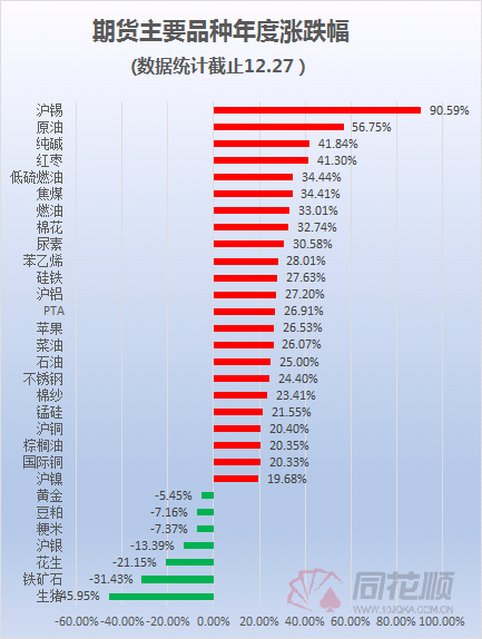 其中,年内涨幅最大的是沪锡,上涨幅度高达90.59%;其次是原油,涨幅亦高达56.75%,而纯碱、红枣等年内涨幅均超41%。