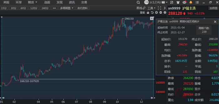 ①年度涨幅最大品种:沪锡(年初至今累计涨幅90.59%)