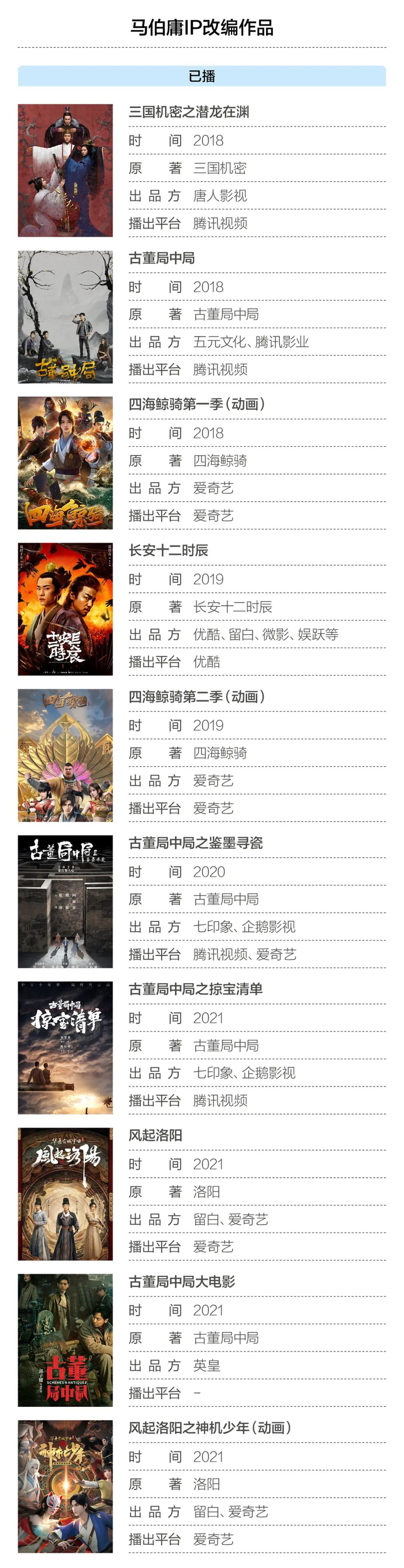 爱奇艺目前总共有十余部马伯庸作品IP待开发,合作者包括稻草熊、新丽传媒、七印象等。腾讯视频在之前已经上线过《古董局中局》三部曲,之后还储备了两部网剧和一部动画剧集。优酷正在筹备《长安十二时辰2》,B站则聚焦在动画剧集层面,依托《长安十二时辰》,规划了动画片《长安十二时辰之白夜行者》。今年5月,融创文化宣布将与马伯庸合作开发“千年桃花源”IP,进行动画番剧、真人剧集和动画电影的开发,并有望实现实景落地。