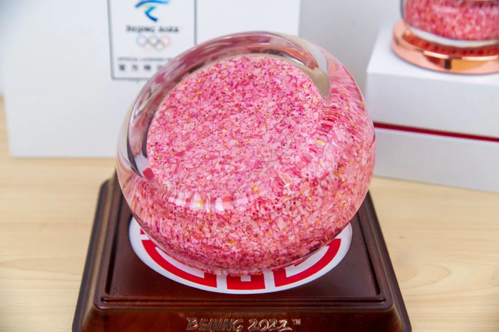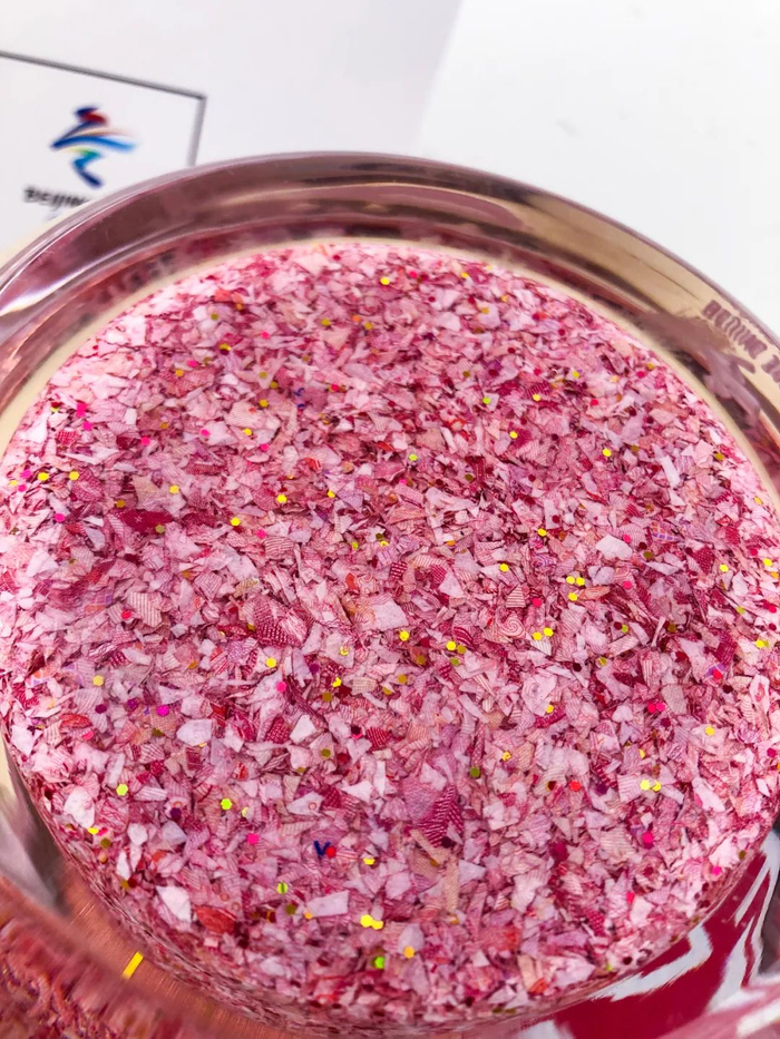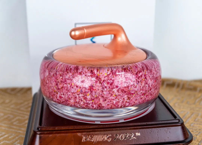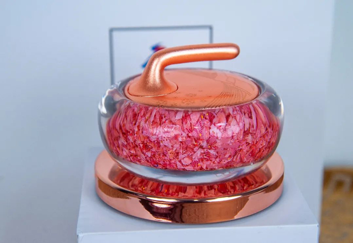 摆件以冰壶原型,内部填充了满满的面值为100元软妹币的碎屑,只不过这些百元大钞都是在生产过程产生的非合格品,也体现了本届冬奥会绿色环保的理念。