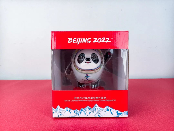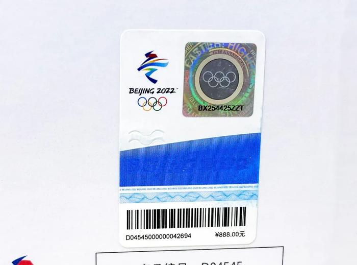 外盒正反面均印有北京冬奥会会徽,底端贴有“北京2022年冬奥会官方特许商品防伪标贴”。