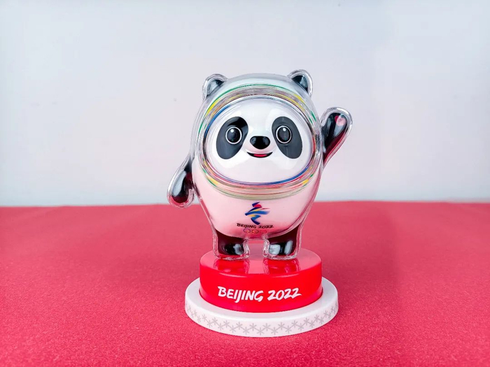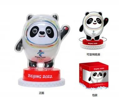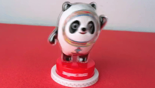 吉祥物周围的“冰丝带”为亚克力压铸内透五色幻彩,底座为双层可旋转结构。