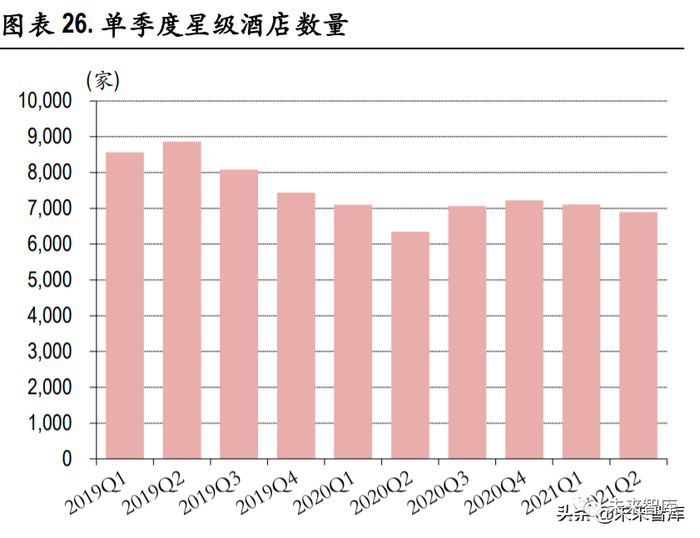 行业出清龙头凸显,行业集中度上升。由于疫情反复,导致酒店行业供给端持续出清,智研咨询数 据显示,2020 年我国单体酒店从 2019 年的 49.13 万家下降至 42.96 万家,客房数量从 19 年的 1,480 万 间下降至 20 年的 1,360 万间。除单体酒店不断减少外,我国的星级酒店也在波动下降,文旅部数据 显示在经历 2020 年第二季度的低谷后,20 年下半年星级酒店有小幅反弹,从 20Q2 的 6,345 家上涨至 20Q4 的 7,222 家,但随后遇到疫情散发,就地过年政策影响,星级酒店迎来又一波下降,截至 2021 年 6 月我国星级酒店数量为 6,894 家。
