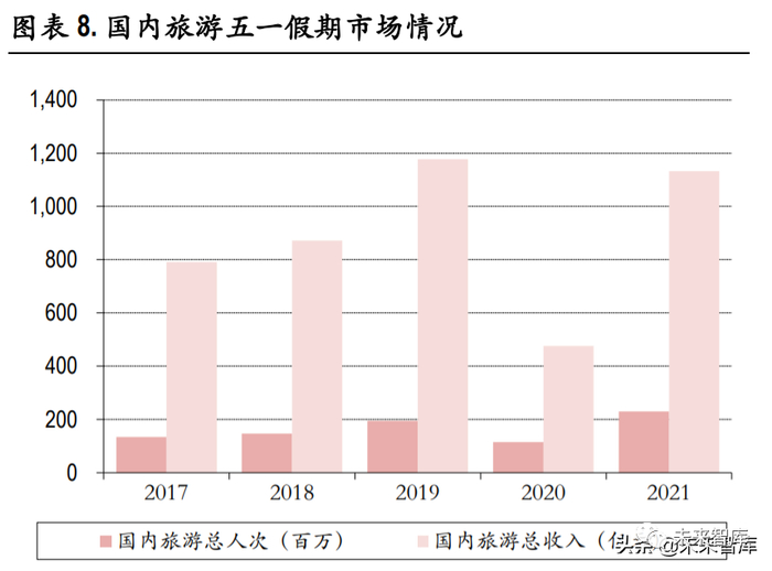 虽 2021 年五一假期旅游人次超过 19 年同期水平,且国内旅游总收入接近 19 年,但不能忽视的是 2021 年五一假期总共为 5 天,而 19 年五一假期仅为 4 天,因此判断恢复情况仍比正常年份存在一定差距。因受到疫情不断扰动,导致 2021 年国庆假期国内旅游总人次和旅游收入与预期存在较大差距,旅游 业全面恢复的道路仍旧道阻且长。