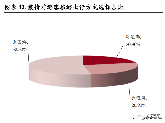 疫情散发长线游受阻,下半年周边游、短途游成主流。据比达咨询数据,疫情前游客旅游出行选择 以出国游为主的占比到 52.3%,其次为长途游 26.90%。疫情导致消费者出行方式有所改变,疫情前大 部分游客出游意愿集中在出境,疫情后国内周边游成假期出游首选。马蜂窝数据显示,1-7 月份短途 游、周边游搜索热度较 2020 年同比上升 258%。2021 年下半年跨省游熔断逐渐常态化,跨省旅游的限 制以及不便使得国内游客的旅游需求转向周边游、短途游的趋势更加明显。(报告来源:未来智库)