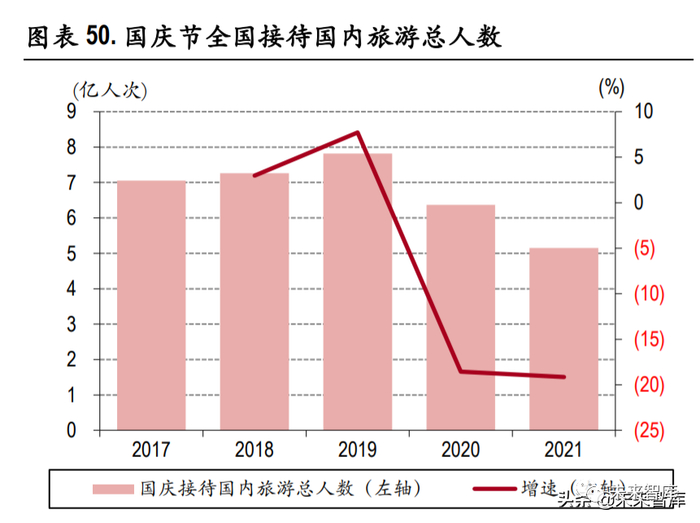实现国内旅游收入 371.49 亿元,恢复至 2019 年中秋假期 的 78.6%。进入四季度,疫情散发仍有影响,根据文化旅游部公告,2021 年国庆黄金周期间,全国接 待国内旅游总人数 5.15 亿人次,同比下降 1.5%,恢复至疫前同期的 70.1%;实现国内旅游收入 3,890.61 亿元,同比下降 4.7%,恢复至疫前同期的 59.9%。十一月,国内新冠疫情新增病例明显增多,甚至 部分地区出现聚集性感染,2021 全年恢复不确定性加剧,整体或呈现“高开缓走低收的趋势”。