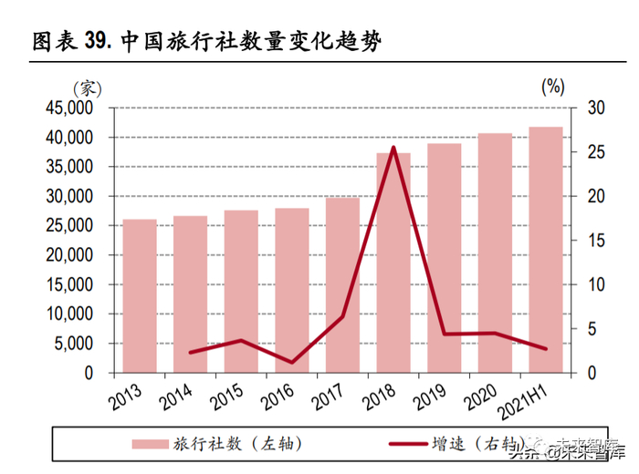 疫情前旅行社发展势头良好,疫情后旅行社遭遇较为严重冲击。2015 年至 2019 年我国旅行社数量从 27,621 家增长到 38,943 家,年均复合增速为 9.14%。传统旅行社在与 OTA 的竞争中,不断优化资源配 臵效率,实现优胜劣汰,良币驱逐劣币,从 2017 年开始恢复较为可观的增长。其中值得注意的是, 旅行社在 2019 年以前的增速持续不仅有传统旅行社自身的规模扩张,同样也有诸如携程、同程等 OTA 企业开始向三四线城市下沉布局线下旅行社门店的贡献,总体来看旅行社行业整体发展势头在疫情 前较为良好。