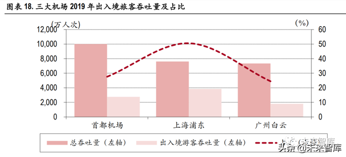 机场免税有望复苏,海南离岛免税购物持续火热 随着出入境渐恢复,口岸免税有望加速复苏。口岸免税店中的机场免税是我国最早的免税业态,由 于疫情的冲击,国内机场免税店目前大多处于关闭状态,后疫情时代,出境游终究会恢复,随之机 场免税也将开启复苏。根据民航局和相关公司公告显示,2019 年北京首都机场、上海浦东机场及广 州白云机场的旅客吞吐量为 10,001.14 万人次、7,615.35 万人次及 7,337.85 万人次,占全国机场旅客总 吞吐量的18.46%。2019年北京首都机场、上海浦东机场及广州白云机场的出入境旅客吞吐量为2,757.43 万人次、3,851.36 万人次及 1,794 万人次,三大机场出入境旅客吞吐量占全国机场出入境总吞吐量的 50.01%。随着北京大兴机场顺利运行,上海浦东机场和广州白云机场的升级扩展,未来三大地区的 出入境吞吐量会逐步增加,口岸免税销售额也有望随之加速恢复。