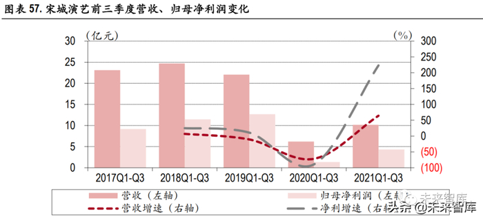 疫情扰动 Q3 业绩,优化存量项目并行外延新业务。公司 21 年前三季度实现营收 10.15 亿元,归母净 利润为 4.32 亿元,分别同比上涨 64.20%、223.38%。第三季度实现营收 为 2.81 亿元,实现归母净利 0.54 亿元,分别同比下降 16.24%、42.29%。受疫情影响 Q3 业绩恢复有所放缓,公司传统景区在突出存量 优势基础上,大力开发新业务模式换取增量。传统存量景区方面,杭州宋城升级打造演艺公园,除 传统演艺项目千古情之外,园区内还增加其他中小型剧目和各类主题活动吸引游客停留,目前效果 尚好,公司公告,园区内散客数超疫前同期水平,游客停留时间也明显增长;公司其他景区对原有 剧目进行优化创新,并加快新剧推广。