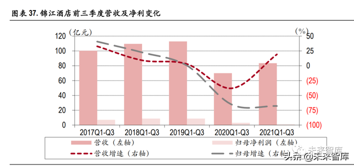 境内业务受疫情扰动恢复暂缓,中高端整体经营好于经济型酒店。锦江酒店前三季度实现营收 83.50 亿元,同比上涨 19.24%,实现净利润 0.97 亿元,同比下滑 67.84%,主要系公司受到 21 年上半年境外 业务因疫情受阻影响的拖累,因此出现净利同比大幅下降。公司 21 年单三季度实现营收 30.87 亿元, 同比上涨 6.00%,归母净利润 0.92 亿元,同比上升 491.90%。
