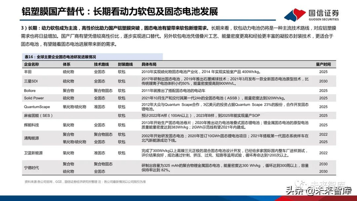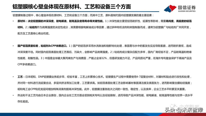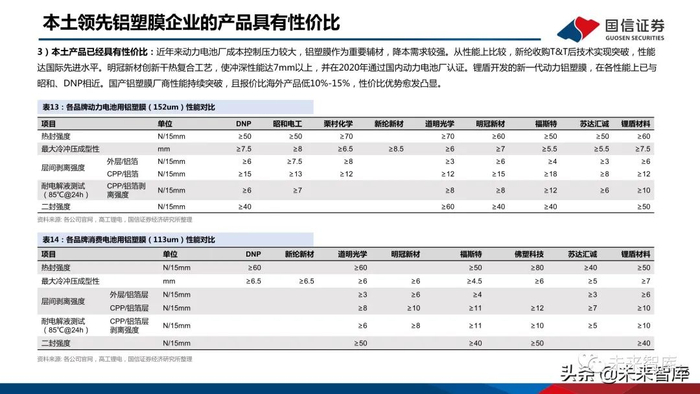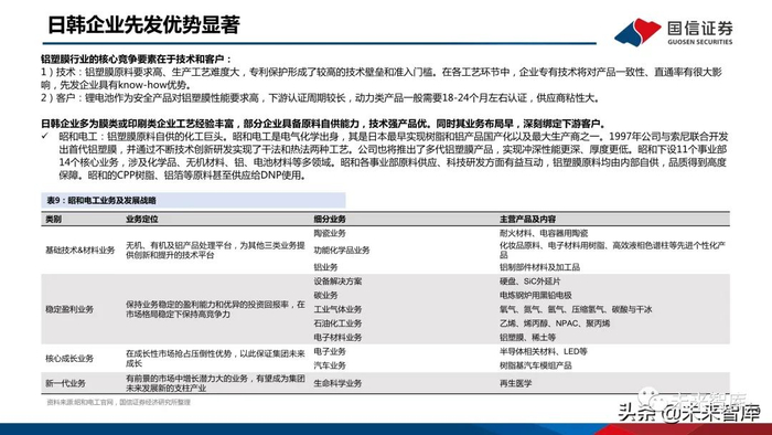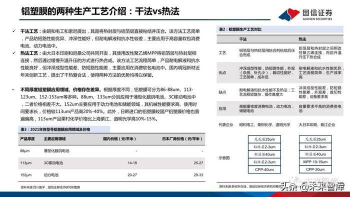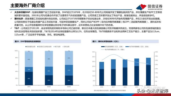 大日本印刷DNP:包装和薄膜产品工艺经验丰富。DNP成立于1876年,在20世纪50-80年代公司相继开发了薄膜包装多款产品,并在薄膜生产和PP工艺等领 域积累丰富经验。2001年公司与尼桑合作开发了主要用于汽车的铝塑膜产品。公司凭借工艺积累开发出了热法产品,耐液性能突出,并连续创新多代。栗村化学:具备薄膜工艺经验和原料供应优势。公司成立于1973年早期聚焦于综合包装业务,20世纪90年代开始布局薄膜产品,并在21世纪开发出铝塑膜。