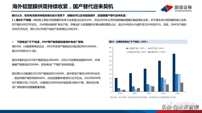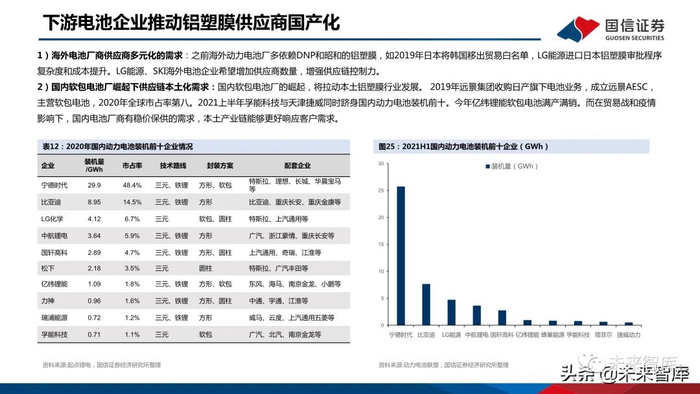 下游电池企业推动铝塑膜供应商国产化 1)海外电池厂商供应商多元化的需求:之前海外动力电池厂多依赖DNP和昭和的铝塑膜,如2019年日本将韩国移出贸易白名单,LG能源进口日本铝塑膜审批程序 复杂度和成本提升。LG能源、SKI海外电池企业希望增加供应商数量,增强供应链控制力。2)国内软包电池厂崛起下供应链本土化需求:国内软包电池厂的崛起,将拉动本土铝塑膜行业发展。2019年远景集团收购日产旗下电池业务,成立远景AESC, 主营软包电池,2020年全球市占率第八。2021上半年孚能科技与天津捷威同时跻身国内动力电池装机前十。今年亿纬锂能软包电池满产满销。而在贸易战和疫情 影响下,国内电池厂商有稳价保供的需求,本土产业链能够更好响应客户需求。