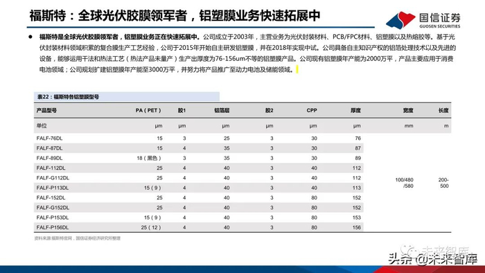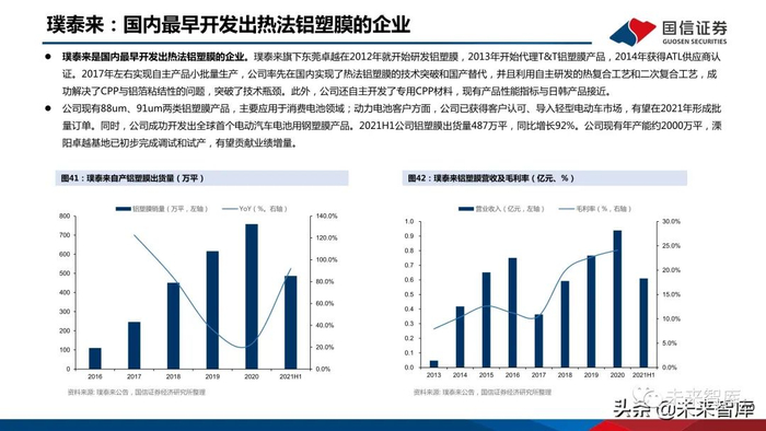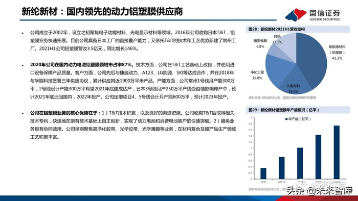 公司成立于2002年,设立之初聚焦电子功能材料、光电显示材料等领域。2016年公司收购日本T&T,铝 塑膜业务快速拓展。目前公司具备日本工厂的直接量产能力,又依托T&T的技术和工艺优势新建了常州工 厂。2021H1公司铝塑膜营收3.5亿元,同比增长146%。2020年公司在国内动力电池铝塑膜领域市占率87%。技术方面,公司在T&T工艺基础上改良,并使用进 口设备保障产品质量。客户方面,公司先后与捷威动力、A123、LG能源、SKI等达成合作,并在2018年 与孚能科技签署三年供应协议,累计供应其近1900万平米产品。