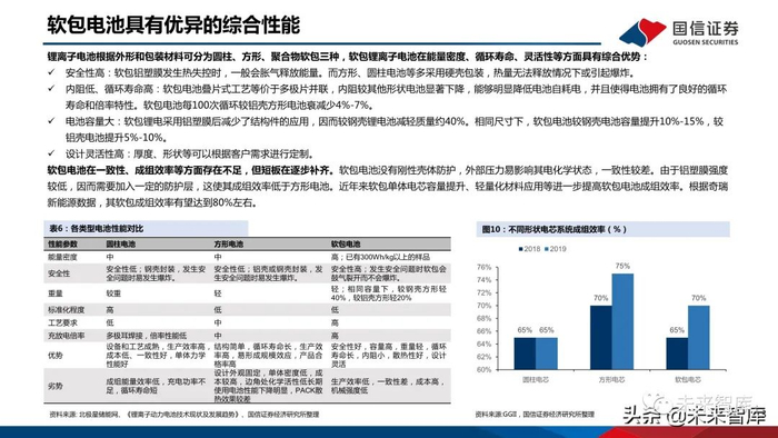 电池容量大:软包锂电采用铝塑膜后减少了结构件的应用,因而较钢壳锂电池减轻质量约40%。相同尺寸下,软包电池较钢壳电池容量提升10%-15%,较 铝壳电池提升5%-10%。设计灵活性高:厚度、形状等可以根据客户需求进行定制。软包电池在一致性、成组效率等方面存在不足,但短板在逐步补齐。软包电池没有刚性壳体防护,外部压力易影响其电化学状态,一致性较差。由于铝塑膜强度 较低,因而需要加入一定的防护层,这使其成组效率低于方形电池。近年来软包单体电芯容量提升、轻量化材料应用等进一步提高软包电池成组效率。根据奇瑞 新能源数据,其软包成组效率有望达到80%左右。